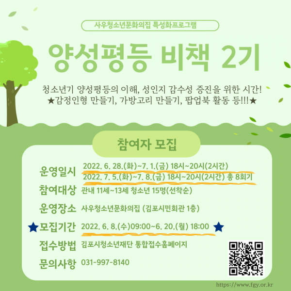 오는 6월 8일부터 6월 20일까지 참가자를 선착순으로 모집하고 김포시청소년재단 홈페이지 통합접수시스템을 통해 프로그램 참가 신청이 가능하다.