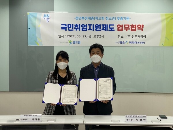 ㈜명은커리어는 고용노동부로부터 국민취업지원제도 사업을 위탁받아 수행하는 업체로서 고양시 꿈드림과 국민취업지원제도 청년특화사업 홍보를 위한 취업설명회 개최, 학교 밖 청소년의 직업정보 및 프로그램 상호 교류, 발굴된 학교 밖 청소년의 적극적인 사업 참여 유도 등에 관해 협력하기로 합의했다.