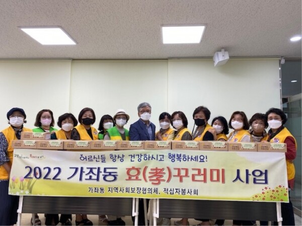 이번 행사는 가좌동 지역사회보장협의체가 주관하고 적십자봉사회가 참여하는 2022년 경로잔치 대안 사업으로 어르신을 공경하는 마음을 담아 효꾸러미를 제작했으며 만 80세 이상 고령 어르신들은 위원이 직접 가정을 방문해 꾸러미를 전달하며 안부를 살필 예정이다.