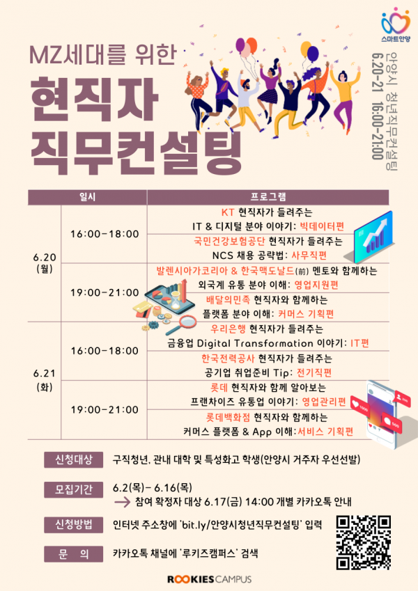 참가 신청은 안양시일자리센터 홈페이지’프로그램’청년직무컨설팅에서 하면 되며 해당부서 문의 또는 카카오채널‘루키스캠퍼스’를 검색해 자세한 사항을 안내받을 수 있다.
