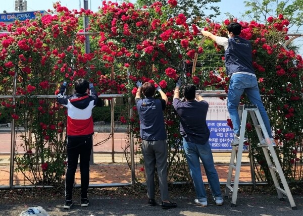 이번 정비활동은 주차장 옆 도로변에 약 40m로 조성된 장미 터널에 웃자란 장미 덩굴가지를 지주에 묶어주거나, 죽은 가지를 솎아주어 주변 거리와 어우러지게 함으로써 행정복지센터를 찾는 방문객들에게 특색 있는 산책로 겸 사진촬영 장소를 제공코자 추진됐다.