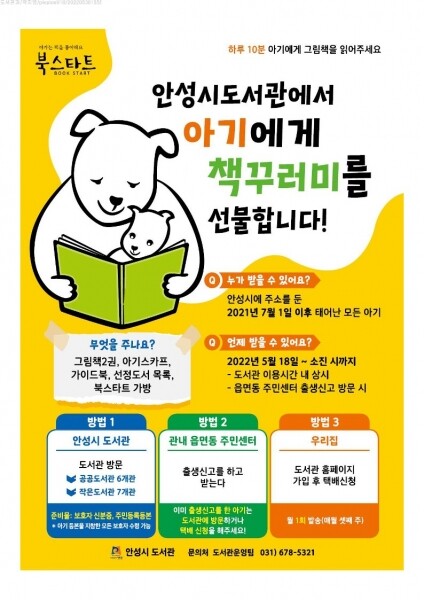 책꾸러미는 해당 연령에 맞는 그림책 2권과 부모를 위한 북스타트 가이드북, 아기 스카프, 에코 가방으로 등으로 구성돼있으며 2021년 7월 1일 이후 안성시에서 출생한 영아 1,500명에게 선착순으로 배부된다.