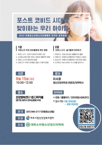 공개강좌는 오는 14일 정오까지 파주 시민 150명을 선착순으로 모집하며 센터 홈페이지 및 전화로 신청하거나 포스터의 QR코드로 접수하면 되며 자세한 사항은 파주시정신건강복지센터로 문의하면 된다.
