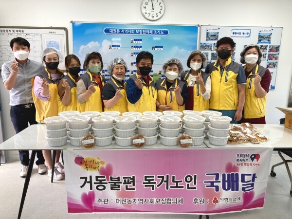 거동불편 독거노인 국배달 사업은 대원동 지역사회보장협의체의 특화사업 중 하나로 독거노인 및 거동불편 어르신들께 매월 2회 정성스레 국을 조리해 전달하고 안부를 살피는 사업이다.