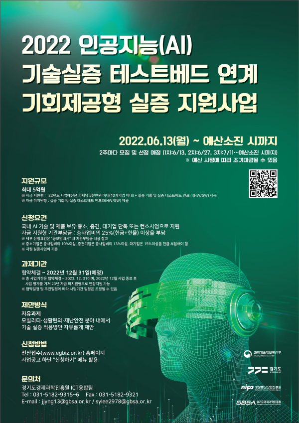 경과원은 인공지능 기술기업의 상용화 지원을 위해 지난 2021년부터 과학기술정보통신부, 경기도, 정보통신산업진흥원과 함께 판교테크노밸리 일대에 'AI기술실증 테스트베드 조성 사업'을 추진하고 있으며 모빌리티, 생활편의, 재난안전 분야에 대한 실증 테스트 환경을 조성하고 있다.