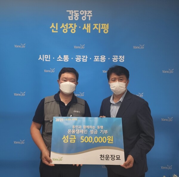 [뉴스써치] 양주시 회천4동 행정복지센터는 천운장묘 컨설팅에서 주위 어려운 이웃을 위해 써달라며 성금 50만원을 기부했다고 밝혔다.
