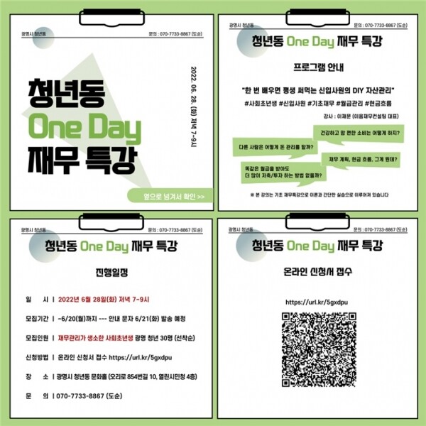 One day class‘재무 특강’은 6월 20일까지 온라인 신청으로 모집하며 재무관리가 생소한 광명시 사회초년생 청년이라면 누구나 신청 가능하다.