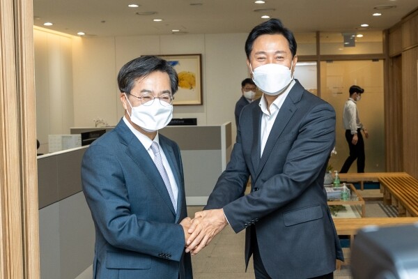 오세훈 시장도 “주거나 교통, 각종 환경문제 등 경기와 서울이 마음을 모아서 준비하고 시행해야 할 중요한 정책이 정말 많다”며 “서울과 경기, 인천이 함께 하는 3자 협의체 같은 논의 기구를 조속히 만드는 것이 필요하다고 생각한다”고 답했다.