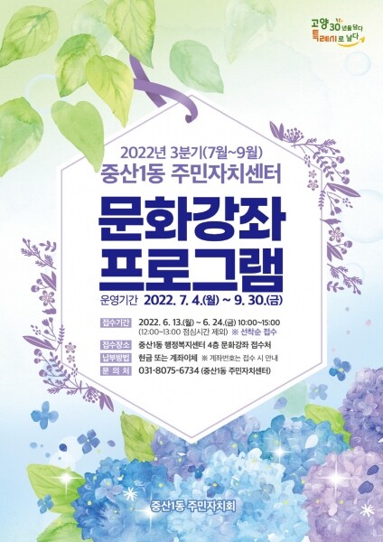 중산1동 주민자치센터 문화강좌 프로그램 접수는 6월 24일까지 매일 오전 10시~오후 3시에 중산1동 행정복지센터 4층 접수처에서 진행되며 자세한 내용은 고양시청 홈페이지 내 중산1동 페이지에서 확인 가능하다.
