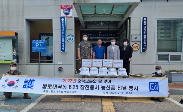 매년 6월 지역 내 참전용사에게 감사의 마음을 전하고 있는 불로대곡동 방위협의회는 이날 행사에도 협의회 위원들이 직접 가정을 방문해 농산물 꾸러미를 전달하는 방식으로 진행됐다.