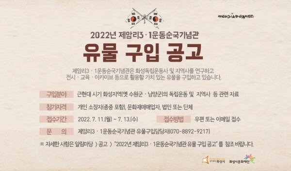 유물 매도 신청 자격은 개인 소장자, 문화재매매업자, 법인 또는 단체 등이며 신청은 7월 11일부터 13일까지로 화성시문화재단 및 제암리3·1운동순국기념관 홈페이지에 있는 서식을 작성해 우편 또는 이메일로 보내면 된다.