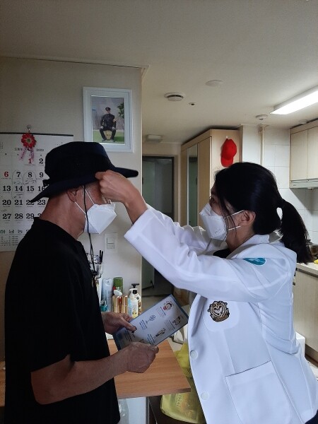 또 남·여 여름철 모자와 냉방바지 등 물품을 전달하며 폭염 피해 예방을 위한 건강관리 요령 등을 안내하고 있다.