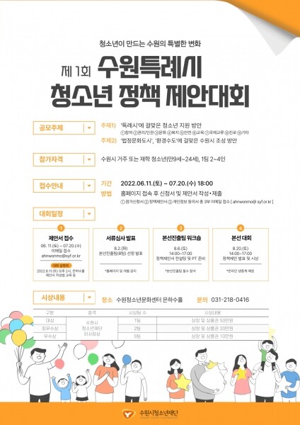 [뉴스써치] 수원시청소년재단 수원청소년문화센터는 7월 20일까지 ‘제1회 수원특례시 청소년 정책제안대회’의 참가자를 모집한다.