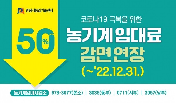 시는 코로나19로 인해 피해를 입거나 경영 부담이 가중된 농가들의 부담을 덜어드리고자 이 같은 결정을 내렸으며 안성시농업기술센터에서 운영하는 4개 사업소의 모든 농기계의 임대료를 감면하는 것이라고 밝혔다.