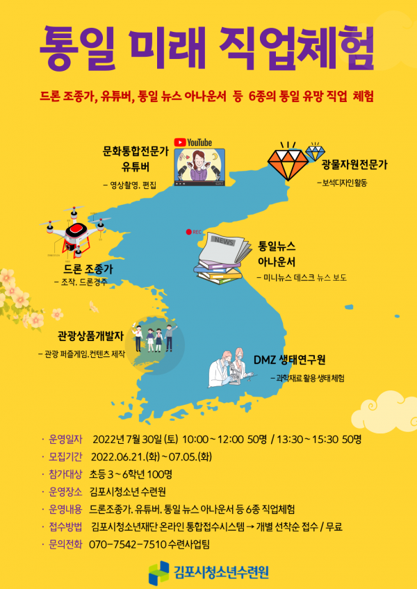 이번 프로그램은 초등학생 3~6학년 청소년을 대상으로 드론조종가, 유튜버, 통일 뉴스 아나운서 DMZ 생태 연구원 등 통일 후의 유망한 직업에 대한 부스 체험활동으로 7월 30일 토요일에 진행될 예정이다.