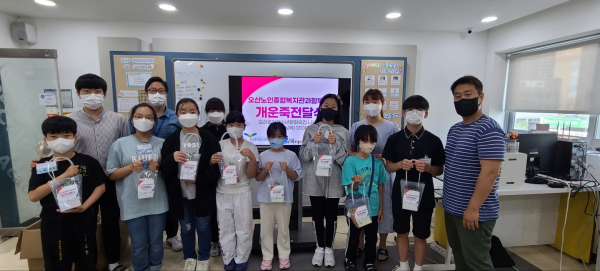 반려식물 개운죽 전달식은 오산노인종합복지관과 함께 진행됐으며 이번 프로그램은 우리 청소년방과후아카데미 전문체험 시간인 미술 활동시간을 활용해 어르신들의 외로움을 달래고 삶의 활력을 불어넣어 정서적인 안정 회복을 위한 취지로 청소년들이 직접 작성한 손편지도 같이 전달됐다.