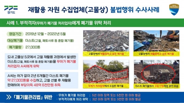 주요 적발 사례를 보면 고양, 남양주, 구리, 포천 소재 고물상 5곳은 고철·비철 폐기물을 재활용하면서 발생한 사업장폐기물을 인천 서구에 위치한 무허가 폐기물 처리업자인 A씨에게 위탁 처리하다 덜미를 잡혔다.