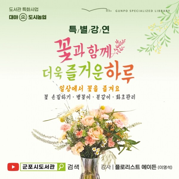 군포시 특화사업과는 오는 6월 23일부터 플로리스트인 이영석 에이든 플로랄 아틀리에 대표를 초청해 ‘꽃과 함께 더욱 즐거운 하루’라는 주제로 특별강좌를 진행한다.