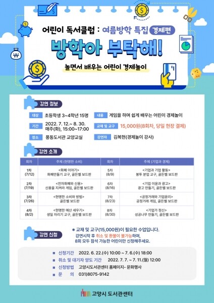 이번 프로그램은 풍동도서관 교양교실에서 진행되며 만들기, 보드게임 등의 놀이를 통해 어린이들이 쉽고 재미있게 경제를 이해하도록 돕는다.