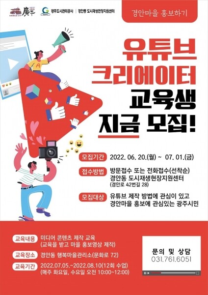 시 관계자는 “이번 유튜브 크리에이터 교육은 시민들에게 새로운 도전의 기회를 제공함과 동시에 1인 크리에이터의 무한한 잠재력을 발견해 주민들의 아이디어를 통해 참신하고 획기적인 경안마을의 도시재생 사업 관련 영상 홍보 방안도 마련할 수 있을 것”이라고 말했다.