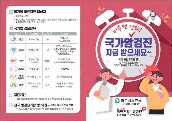 시 거주자를 대상으로 올해 국가 암 검진 대상자인 짝수년도 출생자가 이벤트 기간 내 국가암검진을 받고 파주시 국가암검진 카카오톡 채널 또는 QR코드로 접속해 참여 인증샷을 올리면, 추첨을 통해 9월 15일 300명에게 커피음료 기프티콘을 제공한다.