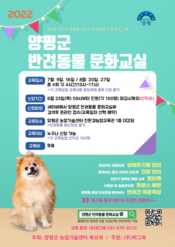 군 관계자는 “양평군의 올바른 반려동물 문화 정착을 위해 많은 반려동물 돌봄가구의 참여를 바란다”고 밝혔다.