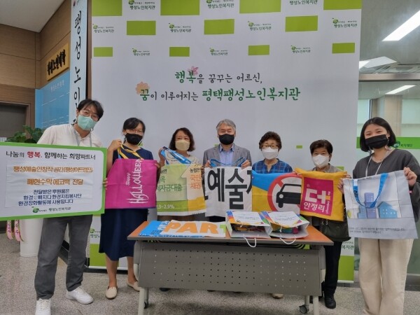 전달된 ‘쓰레기 수거가방’은 팽성예술인창작공간 소속 구성원들이 기부를 목적으로 제작한 물품으로 환경보호와 자원순환을 위해 폐현수막을 재활용해 세탁과 재단 과정 등을 거쳐 제작된 친환경 가방이다.