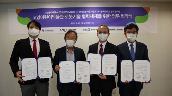 고양문화재단은 6월 27일 고양아람누리에서 정재왈 고양문화재단 대표이사와 한국로봇산업협회 조영훈 전무, 한국로봇사용자협회 이천 센터장, 평택대학교 산학협력단 이태규 단장 등 4개 기관 관계자가 모인 가운데 업무 협약을 진행했다.