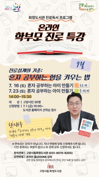 도서관 관계자는 “청소년이 진로를 선택하는데 있어 원하는 진로에 맞춘 공부 방법도 중요하지만, 그 진로에 맞는 학부모의 교육 전략도 중요하다 이번 온라인 학부모 진로특강을 통해 많은 학부모가 전문가의 이야기를 들어볼 수 있는 시간을 가졌으면 좋겠다 시민 여러분의 많은 관심과 참여를 부탁한다”고 전했다.