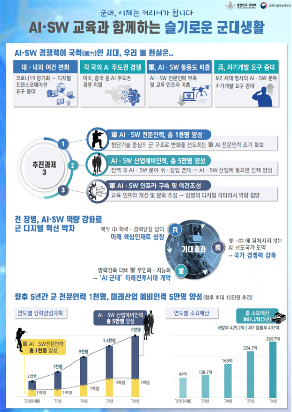 동 비전을 실현하기 위해 과기정통부와 국방부는 각각 '26년까지 전역 후 산업계에서 활약할 디지털 인재 5만명 양성, 과학기술 강군을 선도할 군 전문인력 1천명 양성을 목표로 "군 장병 인공지능·소프트웨어 역량강화" 사업을 추진할 예정이다.