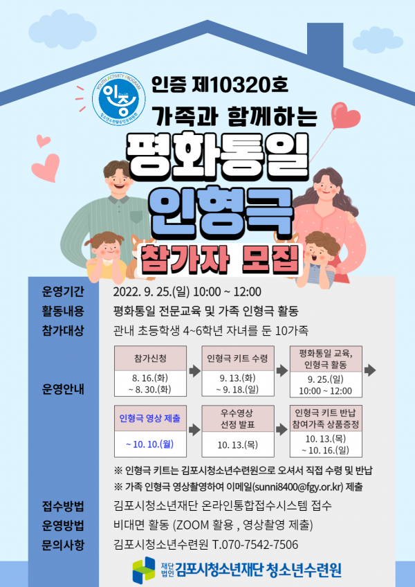 김포시청소년수련원장은 “온 가족이 함께하는 평화통일 인형극 협동 활동을 통한 가족 결속력 향상 및 평화통일에 대한 인식 개선과 건전한 안보관이 확립되길 바란다”고 전했다.
