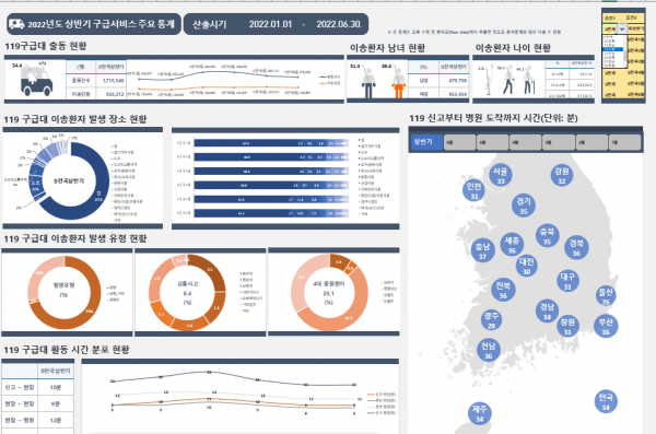 이 현황판으로 119구급대 출동 현황 이송환자 남녀·연령 현황 이송환자 발생장소 발생 유형 119신고부터 병원 도착시간 구급대 활동시간 분포 시간 등을 한눈에 볼 수 있다.