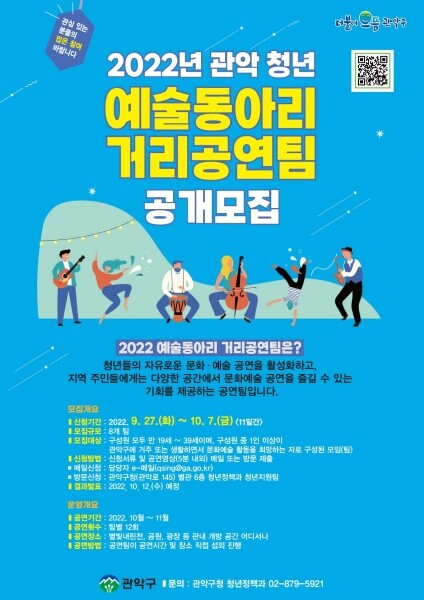 구는 오는 10월 7일까지 ‘2022 관악 청년 예술동아리 거리공연’에 참여할 끼와 재능을 가진 청년 예술인을 모집한다.