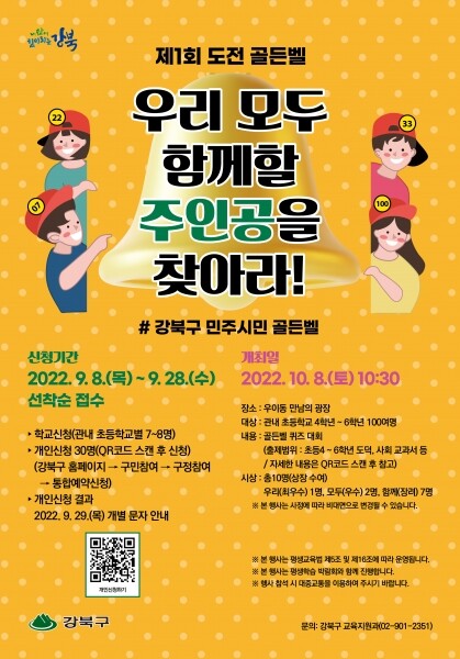 이순희 강북구청장은 “이번 행사를 통해 학생들이 민주시민으로서 잘 성장해 나가길 바란다”며 “많은 분들이 참석해 함께 문제를 풀어보며 아이들을 응원해 달라”고 말했다.