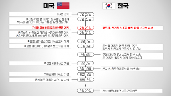 한국시간 기준 7월29일부터 미국 의회·정부·기업·언론 등 인터넷 사이트 내 단순 검색만으로도 IRA법 주요내용 및 전기차 보조금 세부 요건을 확인할 수 있었으나 산업통상자원부는 8월 10일에서야 美무역대표부에 첫 서한을 보낸 것으로 드러났다.