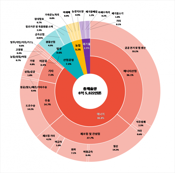 에너지 분야의 배출량은 국가 총배출량의 86.8%에 해당하는 5억 6,992만 톤으로 전년보다 4,165만 톤이 감소했다.