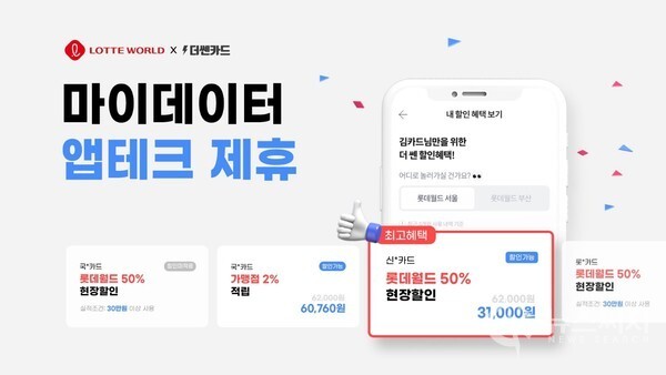 이번 양사 제휴를 통해 롯데월드 어드벤처 이용 고객은 더쎈카드 앱을 통해 롯데월드 어드벤처 제휴카드 및 전월 실적에 따른 예상 혜택을 확인하고 최적의 카드를 선택해 예매까지 한 번에 가능하다.