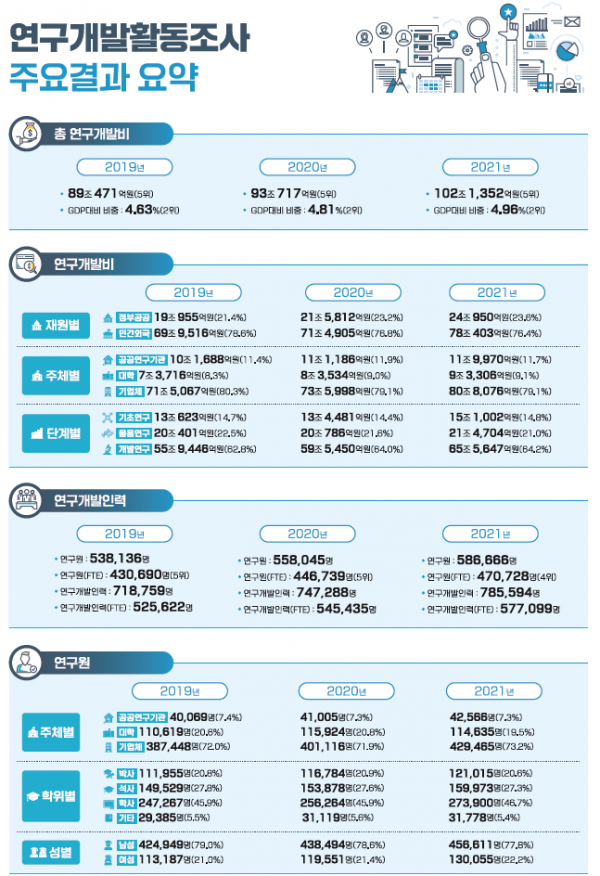 2021년 우리나라의 총 연구개발비는 102조 1,352억원으로 전년대비 9조 636억원이 증가해 처음으로 100조원 시대를 열게 됐고 국내총생산 대비 연구개발비 비중은 4.96%로 이스라엘에 이어 세계 2위권 수준을 유지했다.