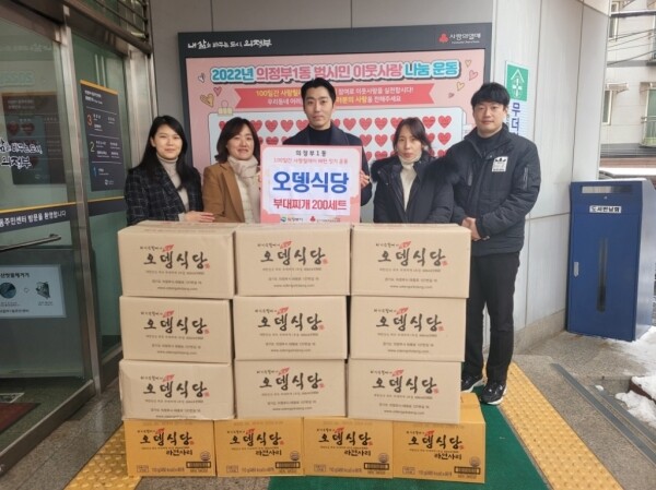 정영민 의정부1동장은 “매서운 한파에도 따뜻한 먹거리로 뜨거운 이웃사랑의 열기를 전하는 오뎅식당에 깊이 감사드린다”며 “후원물품은 어려움을 겪고 있는 이웃들에게 후원하는 이들의 소중한 마음까지 잘 전달하겠다”고 밝혔다.