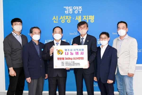 이날 기탁받은 햄세트는 양주시 기부식품제공사업장인 양주기초푸드뱅크, 양주연화푸드마켓을 통해 관내 취약계층에게 전달될 예정이다.