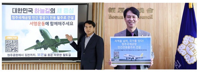 8일, 최재형 보은군수와 윤대성 보은군의회 의장은 ‘청주공항 민간전용 활주로 건설, 서명운동 동참’ 표어를 들고 릴레이 캠페인에 참여했다.