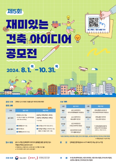 국토교통부와 건축공간연구원(원장 이영범)은 8월 1일부터 10월 31일까지 92일간 ‘제5회 재미있는 건축 아이디어 공모전’을 개최한다.