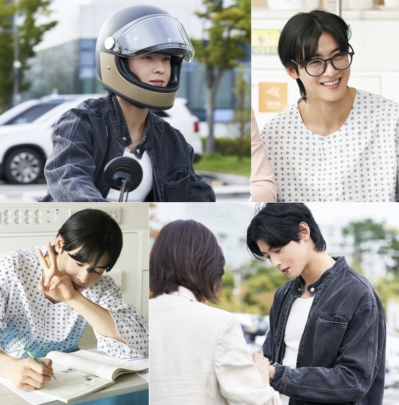 이어진 스틸 속 차은우는 헝클어진 머리와 동그란 뿔테 안경 하나로 너드 같은 귀여운 모습으로 눈길을 끈다. 또한 차은우는 발랄한 브이 포즈를 취하며 촬영장의 분위기 메이커로 톡톡히 활약하고 있어 보는 이들에게 자동 미소를 선사한다. 이에 극 중 다크한 빌런과 달리 촬영장 휴식 시간에는 댕댕미를 뽐내고 사랑스러운 모습을 뽐내며 설렘을 자극한다.