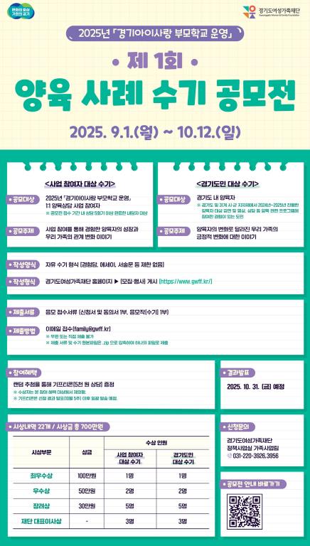 공모전은 ‘2025년 경기아이사랑부모학교 운영사업’의 하나로 마련됐다. ‘경기아이사랑 부모학교 운영’은 양육에 관심 있는 도민을 대상으로 1:1 양육 상담과 맞춤형 교육을 제공하는 사업이다.