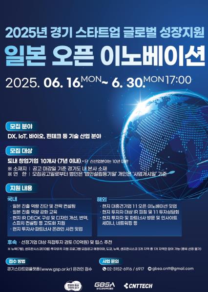 [뉴스서치] 경기도와 경기도경제과학진흥원은 도내 스타트업의 글로벌 도약을 위해 ‘2025년 경기 스타트업 글로벌 성장지원 일본 오픈 이노베이션 프로그램’에 참여할 기업을 오는 30일까지 모집한다.