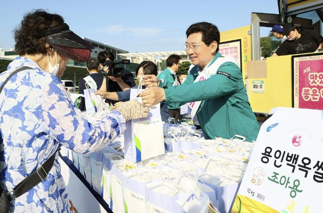 ▲ 19일 용인특례시청 하늘광장에서 열린 용인백옥쌀 아침밥 먹기 캠페인에 참석한 이상일 시장 |