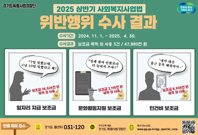 경기도 특별사법경찰단은 작년 11월부터 올해 4월까지 제보와 탐문 등을 바탕으로 사회복지시설들의 위법 여부를 집중 수사한 결과, 보조금의 목적 외 용도 사용 3건을 적발했다고 27일 밝혔다.