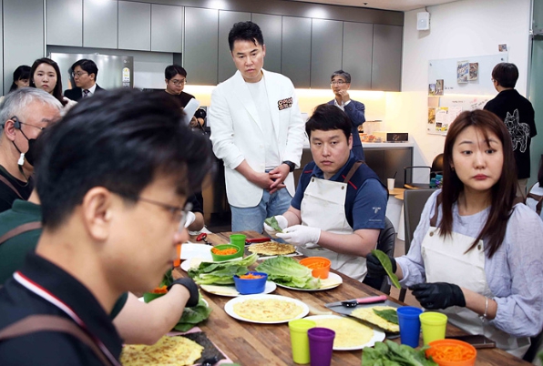 ▲ 오언석 도봉구청장(사진 가운데)이 지역 내 A사업장 대상 ‘단짠타파’ 영양교육 실습 현장을 지켜보고 있다. |