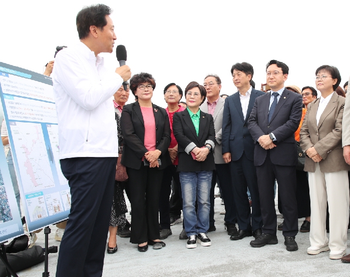 ▲ 이순희 강북구청장(오른쪽 첫 번째)과 오세훈 서울시장(왼쪽 첫 번째), 2023년 6월 오세훈 서울시장이 북한산 주변 고도지구 규제 완화 방안을 설명하고 있다.