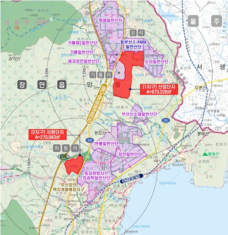이에 따라 시는 이차전지, 전력반도체 등 산업용지 확보를 위한 신규 산업단지 '동부산이파크(2단계) 일반산업단지'를 기장군 장안읍 기룡리, 오리, 좌동리 일원에 약 114만제곱미터(㎡) 규모로 조성한다.